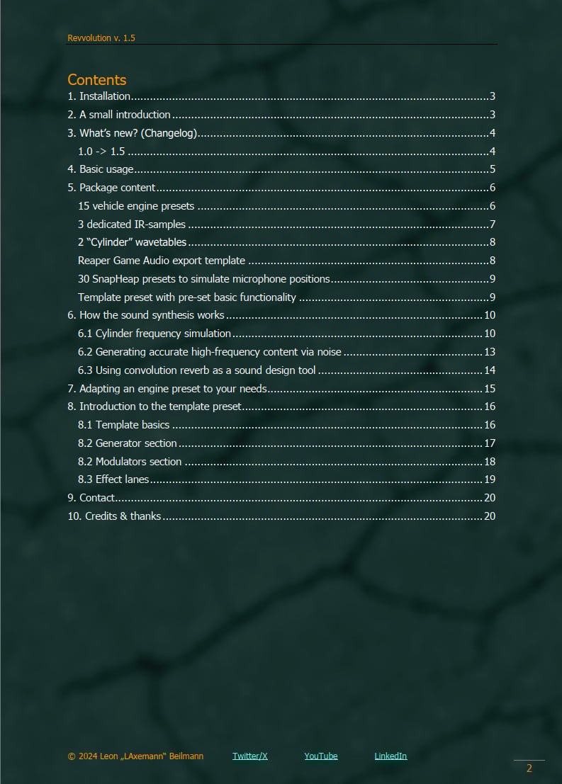 Revvolution is the first content bank dedicated to realistic-sounding, fully synthesized vehicle engines for Phase Plant (and maybe any other synth). Whether you're looking for flexible prototyping, a lifelike game/movie-ready result or simply diving into engine synthesis yourself, Revvolution is for you. Not only does it feature 18 hand-crafted engines that can easily be adapted to your needs. It also comes with 3 dedicated IR samples for convolution, 3 WaveTables, 36 "Microphone Position" presets for SnapHeap, a detailed user guide (including tips, tricks, tutorials and a deep dive into the synthesis itself), a template preset for creating your own engines as well as two Game Audio export templates for Reaper, allowing you to export everything you need within seconds.